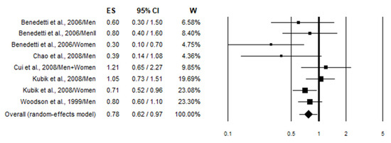 - Higgins, J.P.; Thompson, S.G.; Deeks, J.J.; Altman, D.G. Measuring inconsistency in meta-analyses. BMJ 2003, 327, 557–560. [Google Scholar] [CrossRef]