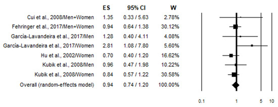 A further subgroup analysis based on gender was conducted, and the results are reported in Table S5 in the Supplementary Materials. It is evident that in no case was a statistically significant effect of wine consumption on lung cancer risk observed.