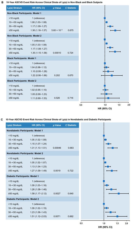 Adjusted 10-year inclusive ASCVD event risk across clinical strata of Lp(a). (A) All participants, males, and females. (B) Non-Black and Black participants. (C) Non-diabetic and diabetic participants. Model 1: Adjusted for age, sex, and race. Model 2: Adjusted for age, sex, race, diabetes status, hypertension, hypertension treatment, smoking status, total cholesterol, high-density lipoprotein cholesterol, and cholesterol-lowering medication use. Lp(a) values were classified according to prespecified clinical strata. The HR (95% CI) is shown in comparison to the Lp(a) < 10 mg/dL stratum (reference). p value represents trend across the categories; the C statistic represents the probably of an event across the categories. Abbreviations: ASCVD, atherosclerotic cardiovascular disease; CI, confidence interval; HR, hazard ratio; Lp(a), lipoprotein(a).