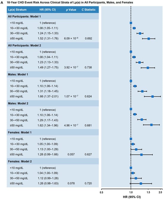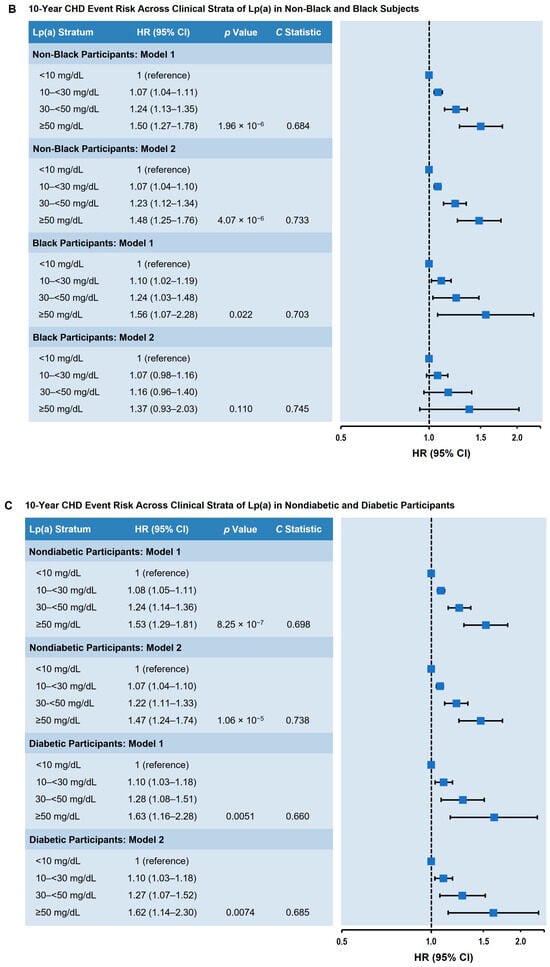 Adjusted 10-year CHD risk across clinical strata of Lp(a). (A) All participants, males, and females. (B) Non-Black and Black participants. (C) Non-diabetic and diabetic participants. Model 1: Adjusted for age, sex, and race. Model 2: Adjusted for age, sex, race, diabetes status, hypertension, hypertension treatment, smoking status, total cholesterol, high-density lipoprotein cholesterol, and cholesterol-lowering medication use. Lp(a) values were classified according to prespecified clinical strata. The HR (95% CI) is shown in comparison to the Lp(a) < 10 mg/dL stratum (reference). p value represents trend across the categories; the C statistic represents the probably of an event across the categories. Abbreviations: CHD, coronary heart disease; CI, confidence interval; HR, hazard ratio; Lp(a), lipoprotein(a).
