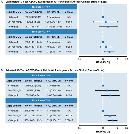 The 10-year ASCVD event risk of all participants across clinical strata of Lp(a) dichotomized by pooled cohort equation risk score. (A) Unadjusted event risk. (B) Adjusted event risk, adjusted for age, sex, race, systolic blood pressure, hypertension treatment, total cholesterol, smoking status, and high-density lipoprotein cholesterol. Lp(a) values were classified according to prespecified clinical strata. HR (95% CI), HRadj, and p value are shown in comparison to the Lp(a) < 30 mg/dL stratum (reference). Abbreviations: ASCVD, atherosclerotic cardiovascular disease; CI, confidence interval; HR, hazard ratio; HRadj, adjusted hazard ratio; Lp(a), lipoprotein(a).
