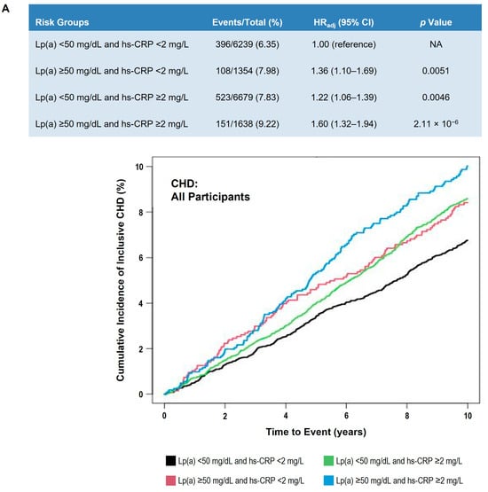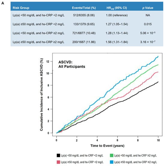 - Zhang, W.; Speiser, J.L.; Ye, F.; Tsai, M.Y.; Cainzos-Achirica, M.; Nasir, K.; Herrington, D.M.; Shapiro, M.D. High-sensitivity C-reactive protein modifies the cardiovascular risk of lipoprotein(a): Multi-Ethnic Study of Atherosclerosis. J. Am. Coll. Cardiol. 2021, 78, 1083–1094. [Google Scholar] [CrossRef] [PubMed]