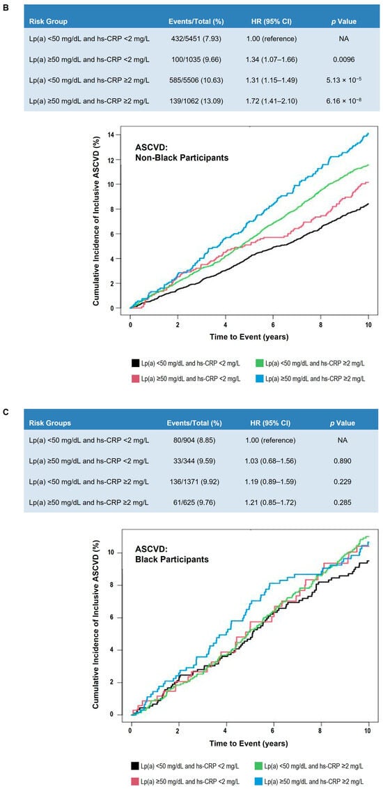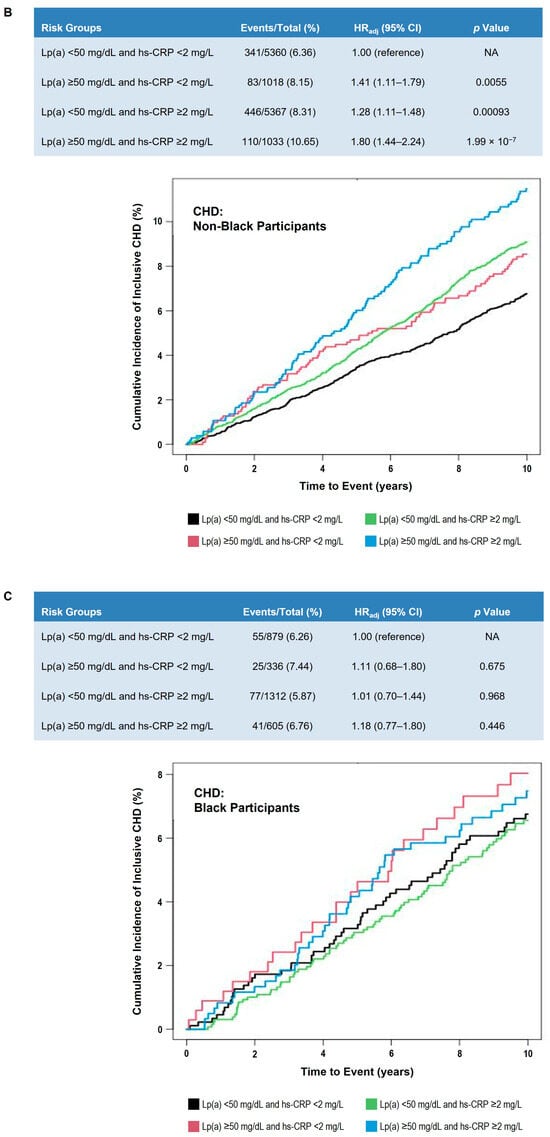 Adjusted 10-year ASCVD event risk in participants classified by Lp(a) and hs-CRP levels. (A) All participants. (B) Non-Black participants. (C) Black participants. Table shows number of events, HRadj, and p value by Lp(a) and hs-CRP clinical strata. Cox proportional hazards model was adjusted for age, sex, race (Panel A only), systolic blood pressure, hypertension treatment, smoking status, diabetes status, total cholesterol, high-density lipoprotein cholesterol, and cholesterol-lowering medication use. Lp(a) < 50 mg/dL and hs-CRP < 2 mg/L was used as the reference group. Graph presents Kaplan–Meier curves of cumulative incidence of events by prespecified Lp(a) and hs-CRP clinical strata. Black line indicates Lp(a) < 50 mg/dL and hs-CRP < 2 mg/L; red line shows Lp(a) ≥ 50 mg/dL and hs-CRP < 2 mg/L; green line shows Lp(a) < 50 mg/dL and hs-CRP ≥ 2 mg/L; blue line shows ≥50 mg/dL and hs-CRP ≥ 2 mg/dL. Abbreviations: ASCVD, atherosclerotic cardiovascular disease; CHD, coronary heart disease; CI, confidence interval; HR, hazard ratio; HRadj, adjusted hazard ratio; hs-CRP, high sensitivity C-reactive protein; Lp(a), lipoprotein(a).