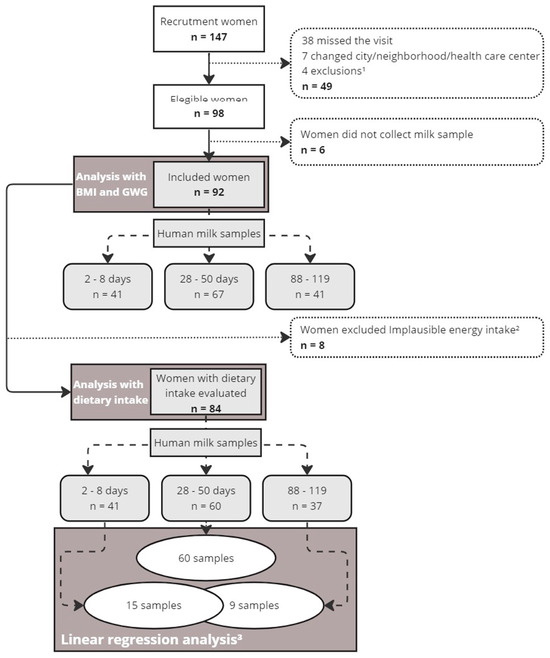 Study design. Flow diagram of the participants with anthropometric and dietary records and their milk samples collected for the analysis of endocannabinoids, hormones, proteins, and triglycerides during lactation in a women cohort of Rio de Janeiro, Brazil. BMI: body mass index; GWG: gestational weight gain. Note: 1 General exclusion included gestational diabetes, preeclampsia, preterm birth, and stillbirth. 2 Women with implausible energy intake include <600 or >6000 kcal/day. 3 In the linear regression analyses, all women with milk samples at 28–50 days postpartum (T2) (n = 60), women with samples at 2–8 days (T1) (n = 15, including those with samples also at the last visit), and those with samples exclusively at 88–119 days (T3) (n = 9) were included.