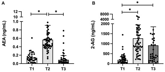 Endocannabinoid concentration in the human milk between 2 and 119 days postpartum. Milk concentration of the endocannabinoids (A) anandamide (AEA) and (B) 2-arachidonoylglycerol (2-AG) at 2–8 (T1, n = 41), 28–47 (T2, n = 67) and 88–119 (T3, n = 41) days postpartum. Data are expressed as median and interquartile intervals and were analyzed using Kruskal–Wallis test, followed by Dunn’s post-hoc test. * p < 0.05.