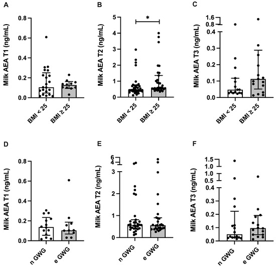 Milk concentration of the endocannabinoid anandamide (AEA) and maternal anthropometry. (A–C) AEA milk concentration at 2–8 (T1, n = 41), 28–47 (T2, n = 67), and 88–119 (T3, n = 41) days postpartum stratified by maternal pre-pregnancy body mass index (BMI; <25 or >25) or (D–F) gestational weight gain (GWG; normal (n GWG) or excessive (e GWG)). Data are expressed as median and interquartile intervals and were analyzed using Mann–Whitney test. * p < 0.05.