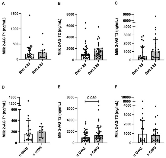 Milk concentration of the endocannabinoid 2-arachidonoylglycerol (2-AG) and maternal anthropometry. (A–C) 2-AG milk concentration at 2–8 (T1, n = 41), 28–47 (T2, n = 67), and 88–119 (T3, n = 41) days postpartum stratified by maternal pre-pregnancy body mass index (BMI; <25 or >25) or (D–F) gestational weight gain (GWG; normal (n GWG) or excessive (e GWG)). Data are expressed as median and interquartile intervals and were analyzed using Mann–Whitney test.