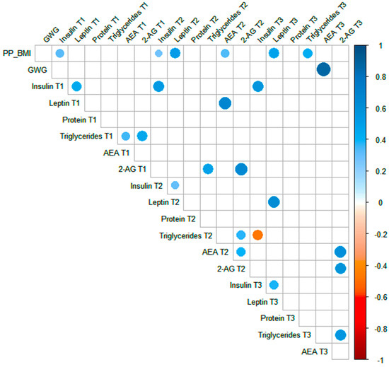 Spearman rank correlations between milk components and maternal anthropometry. Spearman correlations between milk concentration of insulin, leptin, proteins, triglycerides, and endocannabinoids (AEA and 2-AG) at postpartum days 2–8 (T1), 28–47 (T2), and 88–119 (T3) and maternal pre-pregnancy BMI (PP_BMI) and gestational weight gain (GWG). The circle only becomes visible for the correlations with a significance level of p < 0.05. The circles indicate statistical significance (p < 0.05), and their size is directly proportional to the effect size. The blue color indicates a positive correlation, and the red color indicates a negative correlation, according to the scale bar.