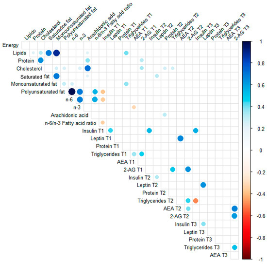 Spearman rank correlations between milk components and maternal diet. Spearman correlations between milk concentration of insulin, leptin, proteins, triglycerides, and endocannabinoids (AEA and 2-AG) at postpartum days 2–8 (T1), 28–47 (T2), and 88–119 (T3) and maternal total energy intake and the consumption of dietary lipids, proteins, cholesterol, saturated, monounsaturated, and polyunsaturated fat, n-3 PUFA, n-6 PUFA, arachidonic acid, and n-6/n-3 ratio. The circles indicate statistical significance (p < 0.05), and their size is directly proportional to the effect size. The blue color indicates a positive correlation, and the red color indicates a negative correlation, according to the scale bar.