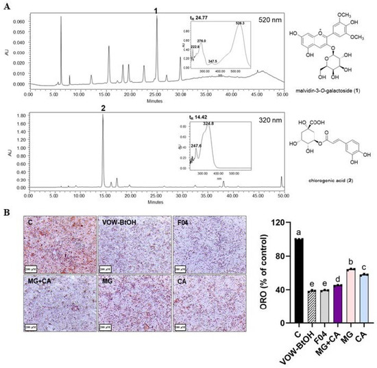 HPLC analysis and lipid accumulation inhibitory effect of each fraction and active compound of VOW. (A) HPLC profiles of the VOW, malvidin-3-O-galactoside (upper panel) and chlorogenic acid (lower panel). (B) Oil Red O staining. ORO data were generated from three independent biological replicates. Different letters are significantly different by Duncan’s multiple range test (p < 0.05).