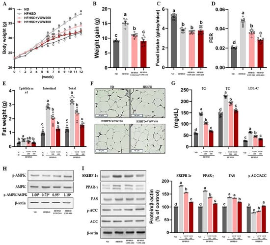 VOW inhibited body and fat weight in high-fat high-sucrose diet-induced obesity. (A) Body weight for 12 weeks. (B) Weight gain. (C) Food intake. (D) FER. (E) Fat weight. (F) H&E staining in white adipose tissue. (G) Serum lipid metabolism. (H) Levels of p-AMPK/AMPK ratio. (I) Protein pattern of lipogenesis in white adipose tissue. Immunoblotting data were generated from three independent biological replicates. Different letters are significantly different by Duncan’s multiple range test (p < 0.05).