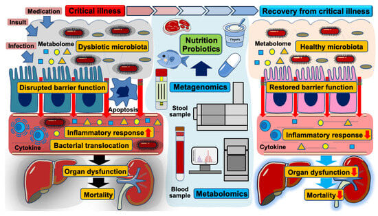 - Cho, N.A.; Strayer, K.; Dobson, B.; McDonald, B. Pathogenesis and therapeutic opportunities of gut microbiome dysbiosis in critical illness. Gut Microbes 2024, 16, 2351478. [Google Scholar] [CrossRef] [PubMed]
