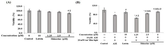 In a previous paper, BL was reported to increase the production of oxi-A2E in RPE cells treated with A2E and induce apoptosis and inflammation. As a result, photoreceptor cells are damaged by lipofuscin and die []. Therefore, we sought to elucidate how MAAs such as shinorine protect against inflammation and/or apoptosis of RPE cells induced by A2E and BL. As shown in Figure 1, lutein (10 µM) and shinorine (5 µM) attenuated A2E- and BL-induced cytotoxicity. Therefore, subsequent experiments were performed using concentrations less than 10 µM and 5 µM, respectively (Figure 1).