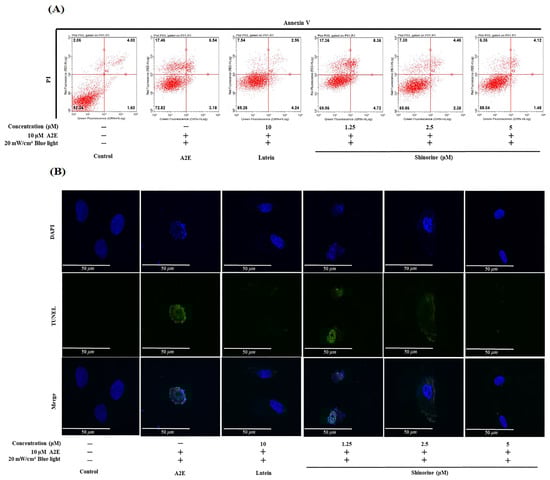 Shinorine reduces apoptosis induced by A2E and BL. (A) Annexin V/PI staining and flow cytometry. Q1: Necroptotic cells; Q2: Late apoptotic cells; Q3: Early apoptosis; Q4: Live cells. (B) TUNEL results indicating a decrease in apoptosis with an increase in shinorine concentration. α-tubulin (green) and DAPI (blue) were visualized using a confocal microscope. Magnification 10×; Scale bar, 50 μm.