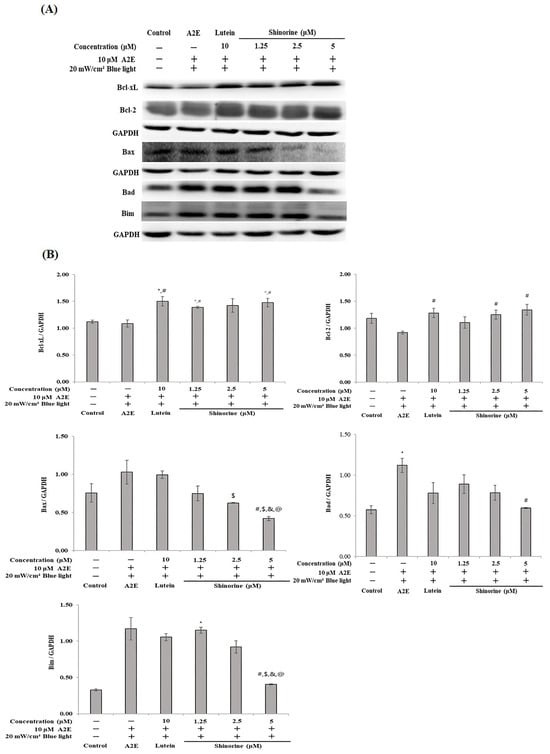 Expression of Bcl family induced by A2E plus BL. (A) Western blot of Bcl proteins. (B) Densitometry (Image J 1.54 software) of expressed Bcl proteins. Mean ± S.D. (n = 3), triplicate. * p < 0.05 vs. CON; # p < 0.05 vs. A2E; $ p < 0.05 vs. Lutein; & p < 0.05 vs. 1.25 µM; @ p < 0.05 vs. 2.5 µM.