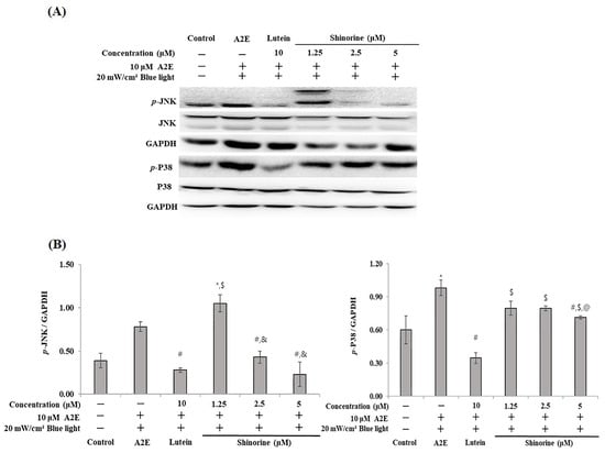 Expression of of MAPKs induced by A2E plus BL. (A) Western blots of p-JNK, JNK, p-P38, P38, and GAPDH. (B) Densitometry (Image J software) of expressed MAPKs. Mean ± S.D (n = 3). Triplicate, * p < 0.05 vs. CON; # p < 0.05 vs. A2E; $ p < 0.05 vs. Lutein; & p < 0.05 vs. 1.25 µm; @ p < 0.05 vs. 2.5 µM.