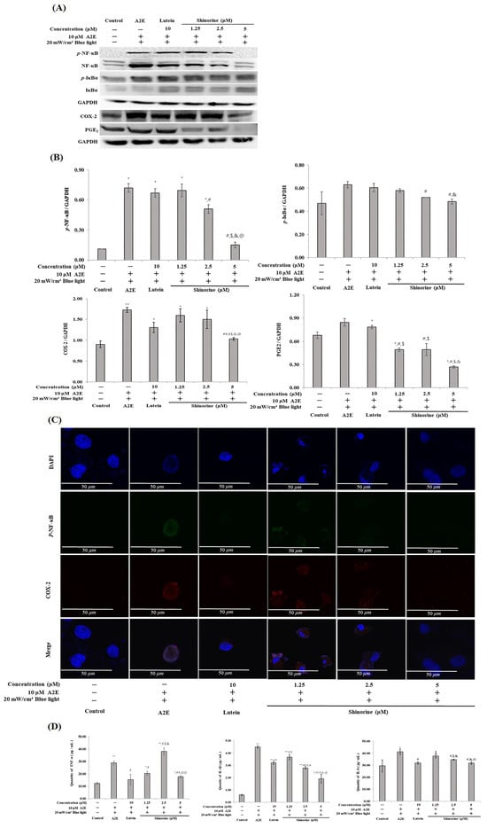 The levels of p-NF-κB and COX-2 were determined via immunofluorescence analysis. The ARPE-19 cells were seeded at 1 × 104 cells/well in a 4-chamber apparatus. After 24 h, the medium was removed, and the cells were treated with shinorine (1.25–5 μM) and lutein (10 μM). The cells were treated with A2E (10 μM) after 24 h and exposed to BL (20 mW/cm2) for 15 min. The cells were washed with PBS, fixed with 4% formaldehyde, and incubated with Triton X-100 (Thermo Fisher Scientific Inc.). The cells were blocked using 1% bovine serum albumin (BSA), incubated with primary antibodies overnight at 4 °C, washed thrice with PBS, and incubated with secondary antibodies. Following nuclear staining with DAPI, p-NF-Κb, COX-2, Alexa Fluor 488-conjugated anti-rabbit IgG, or Alexa Fluor 555-conjugated anti-goat IgG was employed.