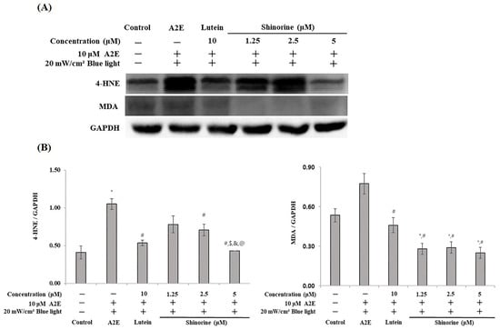 Shinorine decreases carbonyl stress induced by BL plus A2E. (A) Expression of 4-HNE, MDA, and GAPDH; (B) densitometry (Image J software) of 4-HNE, MDA. Mean ± S.D. (n = 3). * p < 0.05 vs. CON; # p < 0.05 vs. A2E; $ p < 0.05 vs. Lutein; & p < 0.05 vs. 1.25 µM; @ p < 0.05 vs. 2.5 µM.