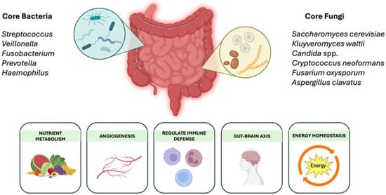 Core bacterial and fungal organisms in the small intestines play essential roles in maintaining gut health, including nutrient metabolism, angiogenesis, immune regulation, and energy homeostasis. An imbalance in these microbial communities can disrupt the relevant functions, contributing to gastrointestinal and systemic health issues. Created in BioRender (Toronto, Canada, publication license: https://BioRender.com/ry5flzn, accessed on 9 April 2025).