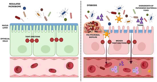 A normal, well-balanced microbiome supports healthy, tight junctions in the intestinal lining, maintaining its selective permeability. However, dysbiosis and pathogenic biofilm formation can compromise these tight junctions, allowing harmful substances to enter the bloodstream and trigger systemic inflammation. In SIBO, bacterial metabolites such as lipopolysaccharides (LPSs), hydrogen sulfide (H2S), and methane disrupt epithelial integrity, contributing to increased permeability. In SIFO, fungal enzymes such as phospholipases and aspartic proteinases further exacerbate gut barrier dysfunction. This increased permeability, often referred to as “leaky gut”, is linked to chronic diseases, autoimmune disorders, and other inflammatory health issues associated with poor diet and gut microbiota imbalances. Created in BioRender (Toronto, Canada, publication license: https://BioRender.com/nlrx413, accessed on 9 April 2025).