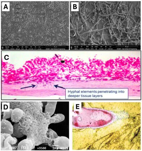Illustration of Candida virulence factors. (A) Scanning Electron Microscopy image of Candida showing its phenotypic plasticity either as oval-shaped budding cells or (B) thread-like structures called hyphae. (C) Microscopy image showing invasive growth of fungal hyphae, indicative of epithelial barrier damage in mouse model (image from Ghannoum [101]). (D) Biofilm formation of Candida demonstrating creation of complex structure that could invade and break down gastrointestinal (GI) lining (image from Ghannoum [102]). (E) Phospholipase production (blue dots) during Candida albicans invasion aids in fungi invasion of GI cell: magnification × 10,000 (image from Ghannoum [103]).