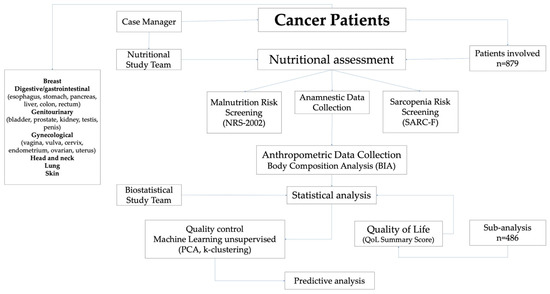 The NUTRISCREEN project is part of the ONCOCAMP research protocol, a retrospective–prospective observational, multicenter study (ClinicalTrials.gov ID: NCT06270602 on 21 February 2024) aimed to enhance the appropriateness, effectiveness, and safety of diagnostic and therapeutic pathways, clinical strategies, and procedures within the Campania Oncology Network (Rete Oncologica Campana, ROC) [23]. In this context, the NUTRISCREEN project was launched by the INT IRCCS “Fondazione G. Pascale” of Naples, with the aim of assessing the nutritional status of cancer patients at diagnosis, during the intake and management phase by the Multidisciplinary Oncology Groups (MOGs). This initiative involved the collaboration of Ente Nazionale di Previdenza e Assistenza a Favore dei Biologi (ENPAB, Rome, Italy) and multiple departments, including clinical nutrition biologists, physicians, the Dietetics and Artificial Nutrition Unit, the Epidemiology and Biostatistics Unit, as well as MOG coordinators and case managers. The primary objective of the NUTRISCREEN project is to identify the risks of malnutrition and sarcopenia in cancer patients using scientifically validated assessment tools. By detecting these risks early in the treatment process, the project aims to improve patient outcomes by implementing targeted interventions. These include personalized lifestyle modifications and the introduction of tailored, evidence-based nutritional strategies, ultimately enhancing the patient’s QoL and prognosis throughout their cancer care journey (Figure 1). This study was conducted in accordance with the Declaration of Helsinki, and approved by the Ethics Committee of the Istituto Nazionale Tumori IRCCS “Fondazione G. Pascale” of Naples (registration number 6/23 OSS “ONCOCAMP” on 10 March 2023).