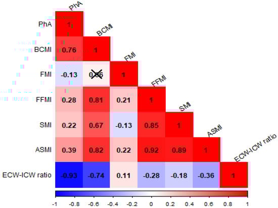 Correlation analysis among the BIA parameters. The horizontal axis indicates the direction and intensity of the correlation coefficient between the two variables intersecting at the single cell. Cross refers to not significant Person’s correlation coefficients (ρs). PhA, Phase Angle; BCMI, Body Cell Mass Index; FMI, Fat Mass Index; FFMI, Fat-free Mass Index; SMI, Skeletal Muscle Index; ASMI, appendicular skeletal muscle mass; and ECW:ICW ratio, Extracellular Water–Intracellular Water ratio.