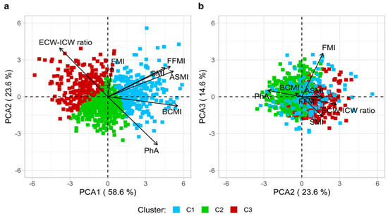 PCA results and k-means clustering outputs for the most important dimensions ((a) 1st and 2nd dimensions; (b) 2nd and 3rd dimensions). C1 = HMP (High Muscle Profile), C2 = MMP (Moderate Muscle Profile), and C3 = LMP (Low Muscle Profile). The overall explained variance was almost 97%. PhA, Phase Angle; BCMI, Body Cell Mass Index; ASMI, Appendicular Skeletal Muscle Index; SMI, Skeletal Muscle Index; FFMI, Fat-free Mass Index; FMI, Fat Mass Index; and ECW-ICW ratio, Extracellular Water–Intracellular Water ratio.