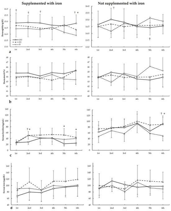 (a) Haemoglobin, (b) haematocrit, (c) serum ferritin, and (d) serum iron during whole season bio-chemistries in participants with and without iron supplementation with different ACE I/D (rs4646994) genotypes. * DD genotype is different from ID genotype for the same biochemistry at p < 0.050. † DD genotype is different from II genotype for the same biochemistry at p < 0.050.