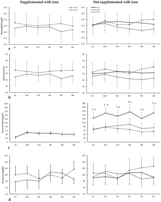 (a) Haemoglobin, (b) haematocrit, (c) serum ferritin, and (d) serum iron during whole season biochemistries in participants with and without iron supplementation with different ACTN3 c.1729C>T (rs1815739) genotypes. * CC genotype is different from CT genotype for the same biochemistry at p < 0.050. † CC genotype is different from TT genotype for the same biochemistry at p < 0.050.