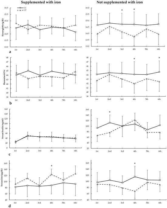 For serum iron (Figure 3d), there were main effects of the biochemistry (F = 5.791, p = 0.001) with no main effects of the iron supplementation (F = 0.548, p = 0.465) and genotype (F = 0.018, p = 0.896). There were statistically significant interactions for these variables on serum ferritin during seasons in biochemistry × supplementation (F = 3.343, p = 0.020), biochemistry × genotype (F = 3.035, p = 0.029), supplementation × genotype (F = 26.743, p < 0.001), and supplementation × biochemistry × genotype (F = 6.753, p < 0.001). The post hoc analysis revealed that, in comparison to CT, CC players not supplemented with iron had increased serum iron in the fourth biochemistry (p = 0.018), similar to players supplemented with iron in the fourth biochemistry (p = 0.003).