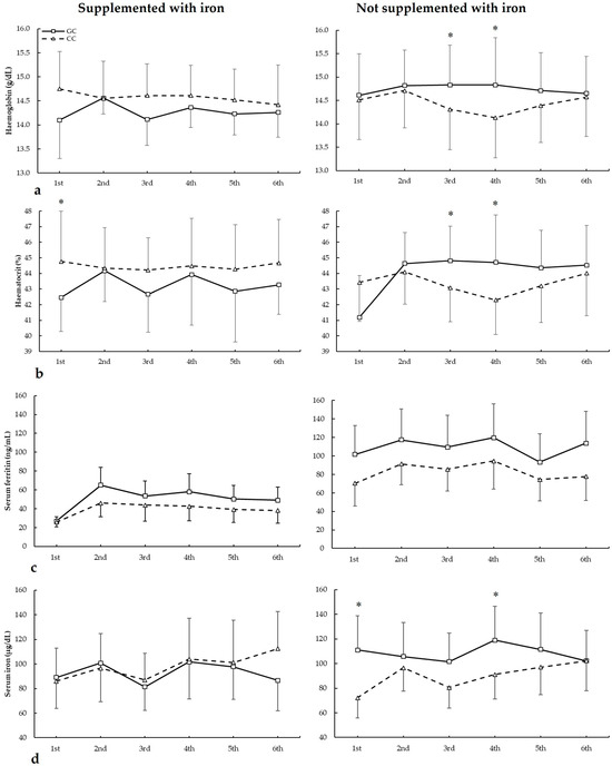 (a) Haemoglobin, (b) haematocrit, (c) serum ferritin, and (d) serum iron during whole season biochemistries in participants with and without iron supplementation with different HFE c.187C>G (rs1799945) genotypes. * GC genotype is different from CC genotype for the same biochemistry at p < 0.050.