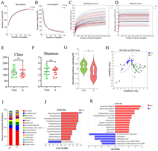Figure 1. Differences in gut microbiota between volunteers during the acute response and acclimatization phases at high altitude. (A,B) Pan/Core analysis. The Pan species curve (A) and Core species curve (B) illustrate changes in total and core species as the sample size increases. The flatness of the pan/core species curve helps determine the adequacy of the sequencing sample size. (C,D) Rarefaction curves based on the Sobs index (C) and Shannon index (D) provide valuable insights into the sufficiency of the sequencing data. A leveling off of the curve suggests that the sequencing data are adequate. (E,F) Comparison of alpha diversity between the Una and A groups, based on Chao’s index (richness) (E) and Shannon’s index (diversity) (F). (G) Comparison of the microbial dysbiosis index between the Una and A groups. (H) Partial Least Squares Discriminant Analysis. Each point represents an individual sample, with points sharing the same color and shape belonging to the same group. (I) Species composition of the Una and A groups at the genus level, with the bar chart displaying the top 15 genera by relative abundance. (J,K) Results of LEfSe analysis highlight significantly different bacterial taxa between the groups. The red color indicates a significant increase in the Una group, while blue indicates a significant increase in the A group. Statistical analyses were conducted using Student’s t-test (E,F) or the Wilcoxon rank-sum test (G), with ** indicating p < 0.01 and “ns” indicating no significant difference.
