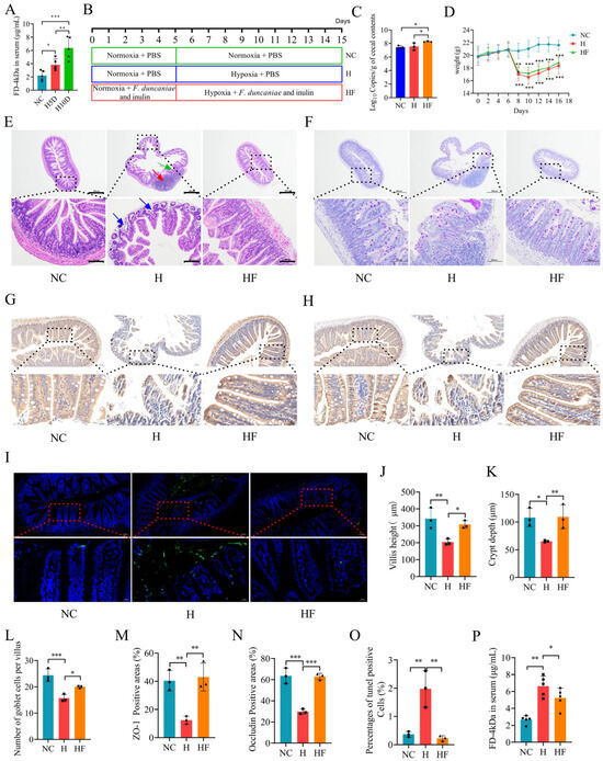 Figure 2. F. duncaniae mitigates intestinal barrier damage induced by high-altitude exposure. (A) Serum levels of the intestinal permeability tracer FITC-dextran were measured using a fluorescence spectrophotometer (n = 5). (B) Flowchart illustrating the animal treatment protocol. (C) Quantification of F. duncaniae in cecal contents via real-time PCR (n = 3). (D) Body weight changes over the 15-day experimental period (n = 8). Statistically significant differences were observed between the NC and H groups, as well as between the NC and HF groups. (E) Representative histological sections of ileum tissue stained with H&E at 40× and 200× magnification (n = 3). (F) Representative histological sections of ileum tissue stained with PAS at 40× and 200× magnifications (n = 3). (G,H) Immunohistochemical analysis of ZO-1 expression at both 10× and 40× magnifications (n = 3) (G) and occludin expression at the same magnifications (n = 3) (H). (I) Representative images of TUNEL staining in ileal tissues at both 10× and 40× magnifications (n = 3). (J) Measurement of villus height in the ileum using IMAGEJ (n = 3). (K) Measurement of crypt depth in the ileum using IMAGEJ (n = 3). (L) Quantification of goblet cell numbers in the ileum using IMAGEJ (n = 3). (M,N) Percentage of positive area for ZO-1 (M) and occludin (N) (n = 3). (O) Percentage of positive cells in TUNEL-stained ileal tissues (n = 3). (P) Serum levels of the intestinal permeability tracer FITC-dextran were measured using a fluorescence spectrophotometer (n = 5). Statistical analysis was conducted using one-way ANOVA (A,C,D,JP). * p < 0.05, ** p < 0.01, *** p < 0.001. Data are presented as means ± SD.