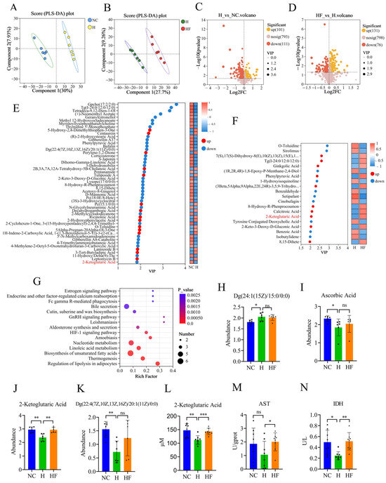 Figure 3. Influence of F. duncaniae on the metabolome of cecal contents. (A,B) PLS-DA analysis was performed to compare the NC and H groups (A), as well as between the H and HF groups (n = 6) (B). (C,D) Volcano plots illustrate the differential metabolites between the H and NC groups (C) and between the HF and H groups (n = 6) (D). (E,F) VIP score analysis, based on the weighted coefficients of the OPLS-DA model, ranks the contributions of metabolites to the differentiation between the NC and H groups (E), as well as between the H and HF groups (n = 6) (F). (G) KEGG pathway enrichment analysis was conducted using the differential metabolites identified between the NC and H groups (n = 6). (HK) The abundances of differential metabolites associated with the HIF-1 signaling pathway were evaluated between the NC and H groups (n = 6). (L) The quantification of 2-ketoglutaric acid was performed at a total protein concentration of 1 g/L of the cecal contents across different groups (n = 8). (M) The activity of AST in the cecal contents was measured across various groups (n = 8). (N) The activity of IDH at a total protein concentration of 1 g/L of the cecal contents was analyzed across different groups (n = 8). Statistical analyses were performed using Student’s t-test (HN). Significance levels were defined as follows: * p < 0.05, ** p < 0.01, *** p < 0.001, and “ns” indicates no significance.