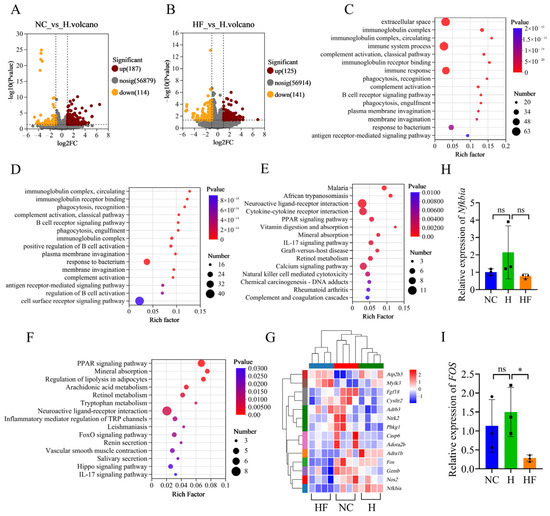 Figure 4. Influence of F. duncaniae on the transcriptome of ileal tissues. (A,B) Volcano plots depict the differentially expressed genes (DEGs) between the NC and H groups (A), as well as between the HF and H groups (n = 4) (B). (C,D) GO pathway enrichment analyses were performed using the DEGs from the comparisons of the NC and H groups (C) and the HF and H groups (n = 4) (D). (E,F) KEGG pathway enrichment analyses were conducted for the DEGs in both the NC versus H groups (E) and HF versus H groups (n = 4) (F). (G) Heat maps illustrate the DEGs associated with the Apoptosis and Calcium Signaling Pathways (n = 4). (H,I) RT-qPCR validation of the expression levels of Nfkbia and Fos (n = 4) was carried out. Statistical analyses were performed using one-way ANOVA (H,I), with significance levels defined as follows: * p < 0.05, and “ns” indicates no significance.