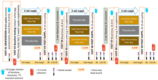 Study participants reported to the Human Performance Lab in an overnight fasted state and provided a blood sample, ingested the supplement (one high- or low-dose hemp fiber bar or placebo bar), and then cycled 2.25 h at high intensity (~70% VO2max) while ingesting water alone (3 mL/kg every 15 min). Immediately following the cycling bout, subjects ingested the SS. Blood samples were collected at 0 h, 1.5 h, and 3.0 h post-exercise. All urine excreted for 5 h after SS ingestion was collected. The testing protocol during the lab sessions with the 2.25 h cycling sessions was organized as follows: