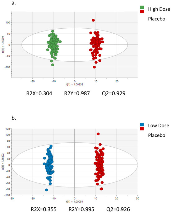 (a,b) OPLSDA analysis of high− and low−dose hemp study arms relative to placebo. Data represent metabolite changes from pre−supplementation time points across each of the four other time points (post−2 weeks supplementation, immediately post−2.25 h cycling, and 1.5 h and 3 h post-exercise.