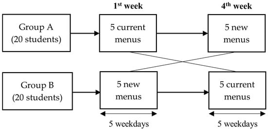 One group (20 students) consumed the current menu in the first week and switched to the new menu in the fourth week, while the other group followed the reverse order. Study procedures are shown in Figure 1.