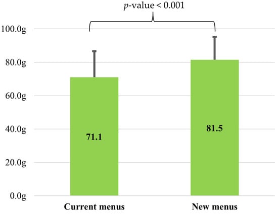 Figure 2 illustrates the comparison of vegetable intake between current and new menus. The vegetable intake on the current menu was 71.1 g (95%CI: 65.2–75.1), significantly lower than that on the new menu with 81.5 g (95%CI: 77.1–85.9) (p < 0.001). The average difference between the two types of menus was 10.4 g.