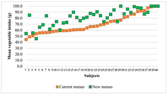 Figure 3 illustrates that the majority of subjects—approximately 90%—consumed more vegetables with the new menus compared to the current ones. The increase in vegetable intake varied among subjects. While the most substantial improvement reached up to 40 g, indicating a significant dietary change for some individuals, others showed only modest increases or no change at all. A few subjects even showed minimal or no improvement in their intake. Notably, subjects with initially low consumption on the current menus were able to boost their intake on the new menus significantly. Additionally, more subjects consumed the whole vegetable portion under the new menus, in contrast to just one subject who did so under the current menu. These findings suggest that individual responses varied while the new menus were broadly effective.