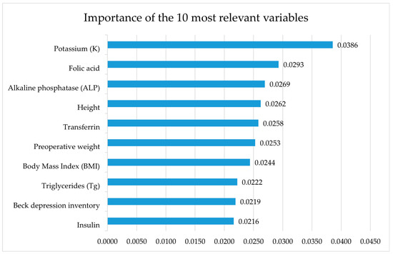 The results indicate that among the biochemical variables, potassium (K) had the highest importance (0.0385), followed by folic acid (0.0293), alkaline phosphatase (0.0269), transferrin (0.0258), triglycerides (0.0222), and insulin (0.0216). Among the anthropometric variables, the most significant were height (0.0262), preoperative body weight (0.0253), and the BMI (0.0244). Regarding psychological and quality-of-life variables, the Beck depression inventory (0.0219) was the most relevant.
