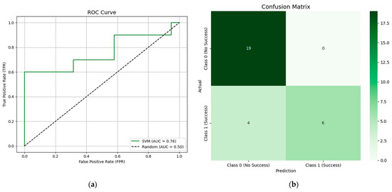 Figure 2a presents the ROC curve for the SVM model, which achieved the best results (AUC = 0.76). This ROC curve graphically represents the relationship between the true positive rate and the false positive rate across different threshold values. Figure 2b displays the confusion matrix, showing that the model correctly classified 19 non-success cases and 6 success cases, with 4 false negatives and 0 false positives.