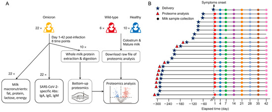 Study design. (A). Study workflow. (B). Sample collection for Omicron cohort. The day of delivery was marked by blue stars, donors for proteome analysis were marked by red triangles, the time points of milk sample collection upon symptom onset were marked by different colors of dots.