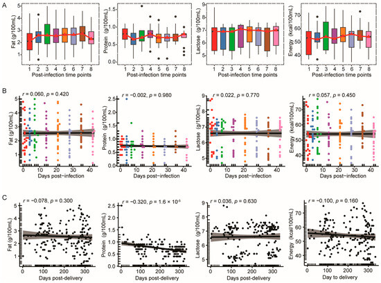 Longitudinal analyses of fat, protein, lactose, and energy content across eight post-infection time points revealed no statistically significant variations (Figure 2A). Furthermore, correlation analyses between days post-infection and macronutrient levels demonstrated no significant associations (Figure 2B). To account for the potential confounding effects of lactation stage, we investigated the relationship between postpartum duration and macronutrient profiles. Notably, protein content showed a weak but significant negative correlation with days post-delivery (r = −0.32, p = 1.6 × 10−5), indicating a progressive decrease over time, while fat, lactose, total solids, and energy content remained relatively stable (Figure 2C).
