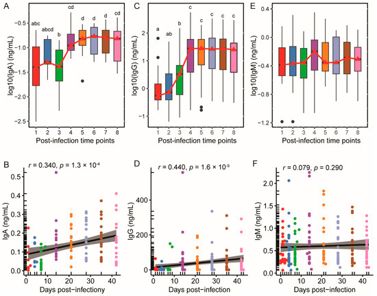 The dynamics of SARS-CoV-2-specific IgA, IgG, and IgM over post-infection. (A,C,E) show the log10-transformed concentrations of SARS-CoV-2-specific IgA, IgG, and IgM, respectively. Groups labeled with the same letter are not significantly different, while those with different letters indicate statistically significant differences (adjusted p < 0.05). Different time points are represented in different colors. Red triangles indicate the median for each time point, which are connected by red lines. (B,D,F) depict the scatter plots and Spearman’s correlation of SARS-CoV-2-specific IgA, IgG, and IgM and days post-delivery. Different time points are represented in different colors. A regression line was fitted to the data, and the 95% confidence interval for the regression line was included.