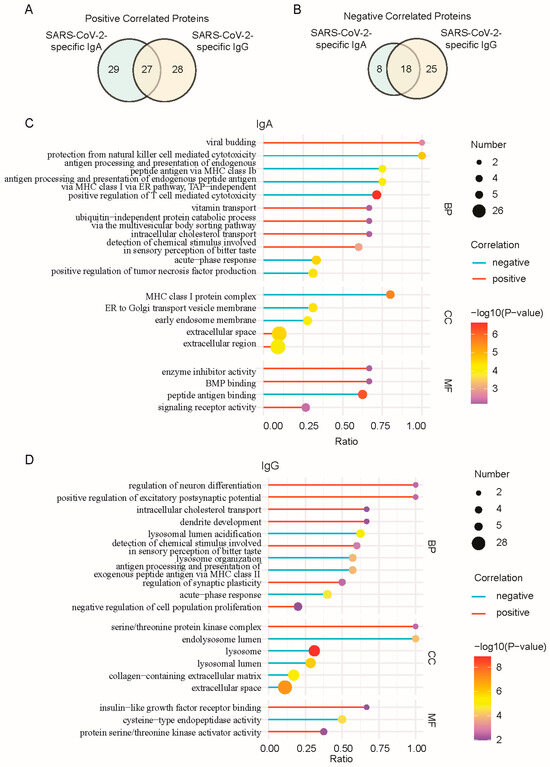 Proteins temporally coordinated with SARS-CoV-2-specific IgA and IgG kinetics. Venn diagram for proteins exhibited significant (A). positive correlations and (B), negative correlations with IgA or IgG kinetics. (C,D), respectively, represent the GO terms enriched in the differentially expressed proteins related to the changing trends of SARS-CoV-2-specific IgA and IgG. The color of the stick represents positive correlation (red) and negative correlation (blue). The color of the dot represents the p-value of the hypergeometric test. The size of the dot represents the number of significant correlated proteins in the corresponding GO term. BP: biological process; CC: cellular component; MF: molecular function.