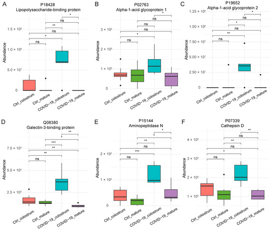 Box plots of abundance of selected proteins exhibiting conserved expression trends across wild-type and Omicron variants. (A). Lipopolysaccharide-binding protein (LBP). (B). Alpha-1-acid glycoprotein 1 (AGP1). (C). Alpha-1-acid glycoprotein 2 (AGP2). (D). Galectin-3-binding protein (Gal-3BP). (E). Aminopeptidase N (APN). (F). Cathepsin D. The x-axis categorizes samples into four groups: Ctrl_colostrum (healthy control colostrum) is represented in pink, Ctrl_mature (healthy control mature milk) is represented in green, COVID-19_colostrum (COVID-19 colostrum) is represented in blue, and COVID-19_mature (COVID-19 mature milk) is represented in purple. The y-axis represents protein abundance. Statistical significance between groups is denoted by: ns (not significant), p ≥ 0.05; * p < 0.05; ** p < 0.01; *** p < 0.001.