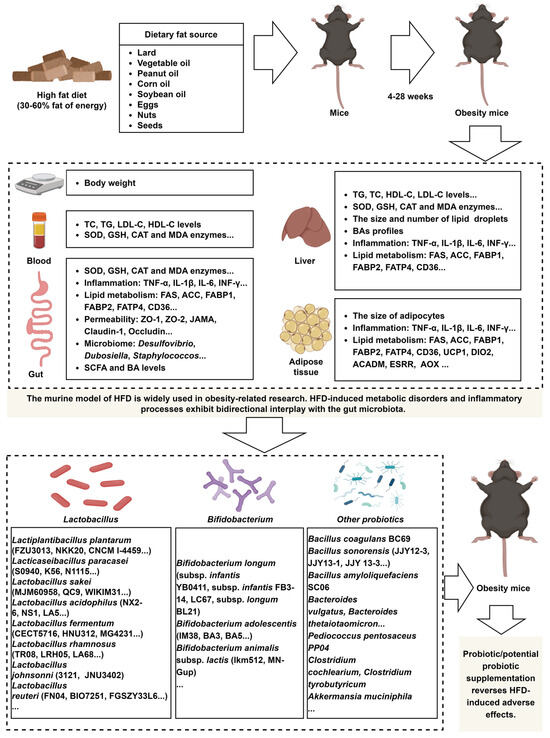 The murine model of HFD is widely used in obesity-related research. HFD-induced metabolic disorders and inflammatory processes exhibit bidirectional interplay with the gut microbiota (Figure 1). The advancement of high-throughput technologies has led to a growing number of studies investigating microbial strains that mitigate the adverse effects of HFD, although most of these strains belong to the Lactobacillus. However, research on strains from genera identified by 16S rRNA sequencing and metagenomic analyses as taxa potentially linked to probiotic properties, such as Bifidobacterium, Akkermansia, Prevotella, and Osclibacter, remains limited, as these techniques primarily reveal taxonomic associations rather than direct evidence of probiotic functions. Future studies should prioritize mechanistic investigations of strains within these genera to evaluate their probiotic potential.