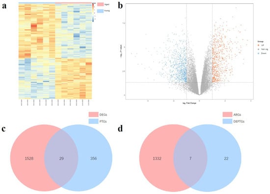 (a) Heat map of GSE62093’s differential expressed genes. (b) Volcanic map of GSE62093’s differential expressed genes. (c) Venn map between DEGs and PTGs, containing 29 DEPTGs of HT. (d) Venn map between DEPTGs and ARGs, containing seven AR-DEPTGs.